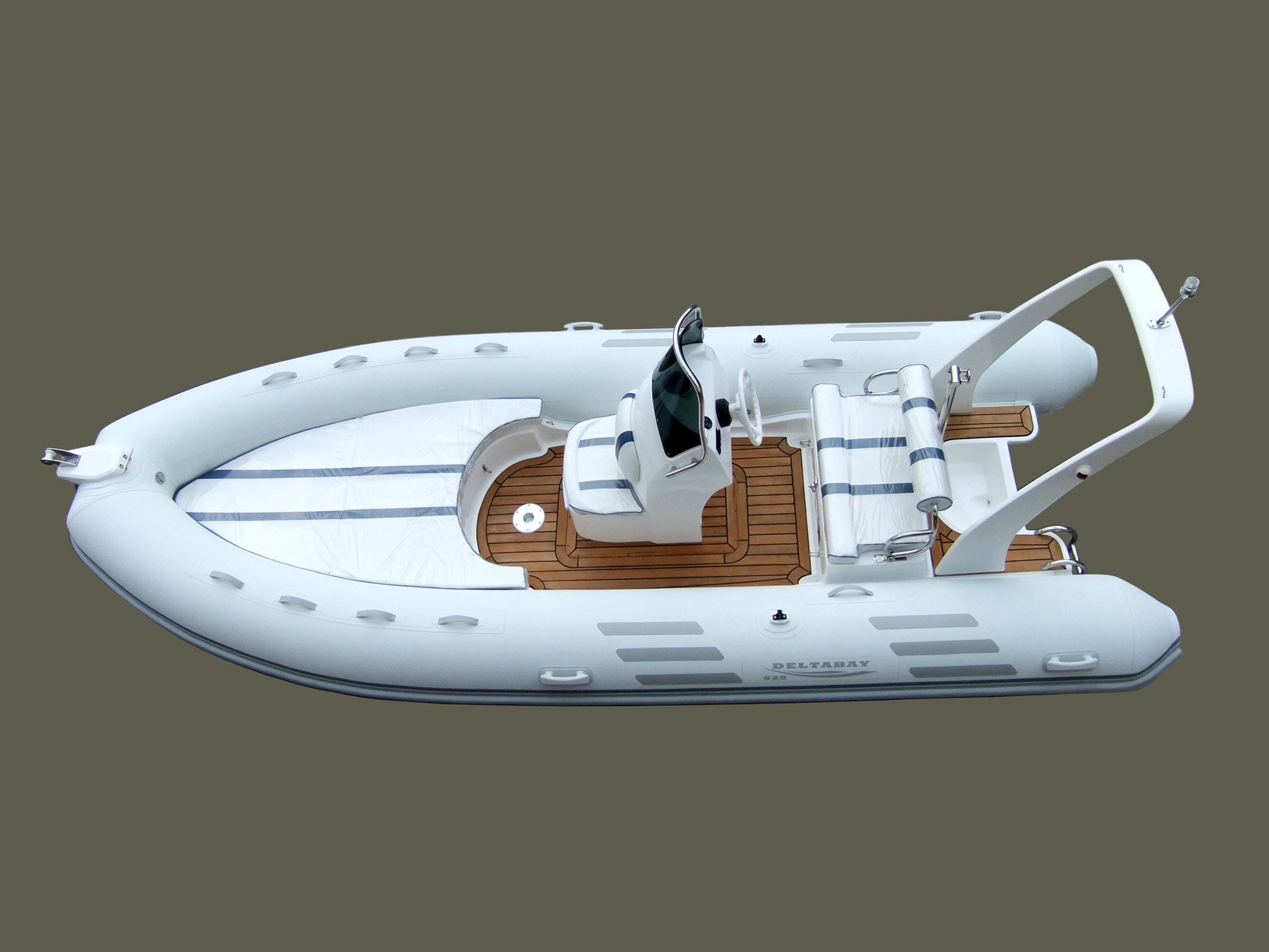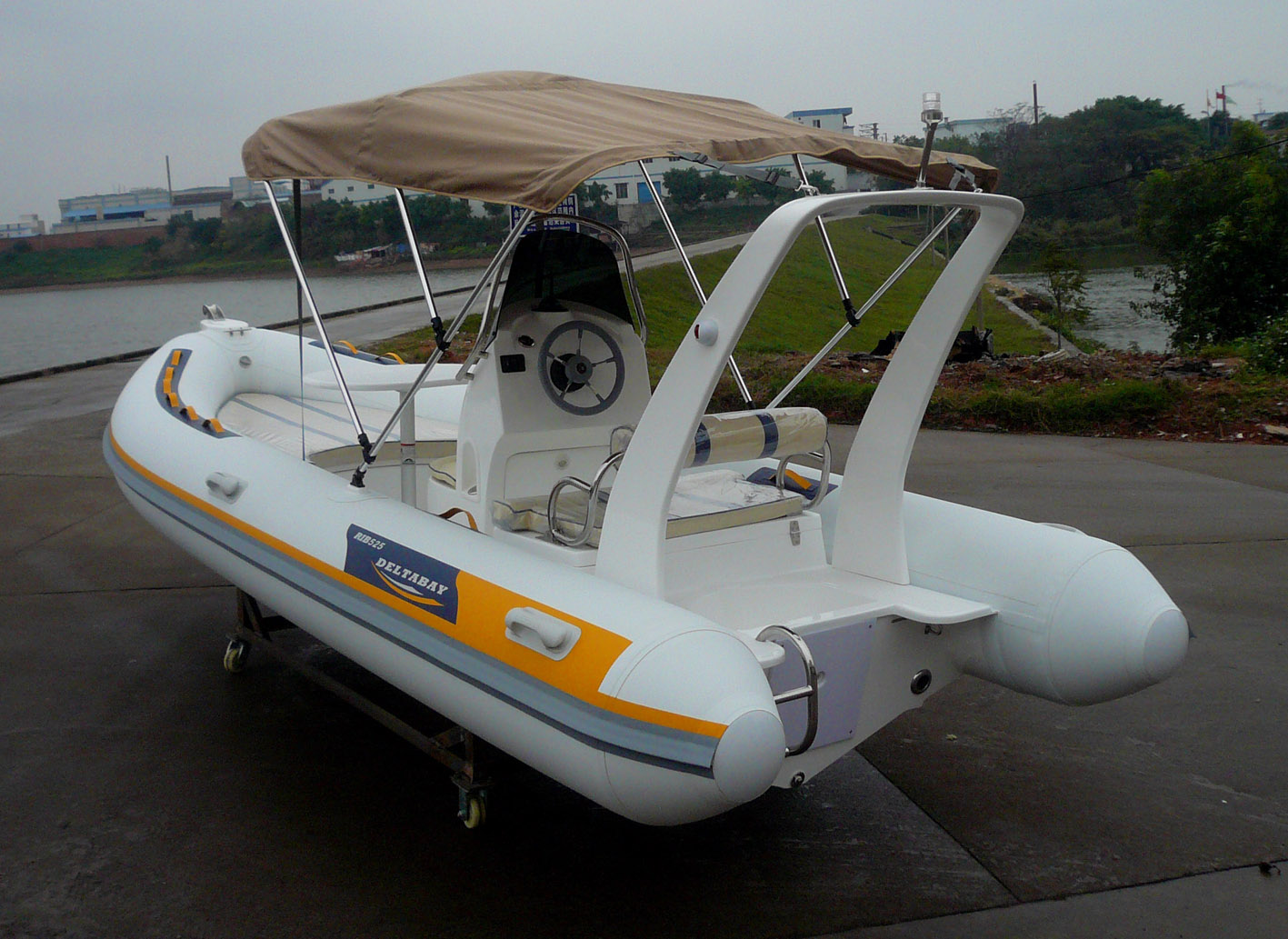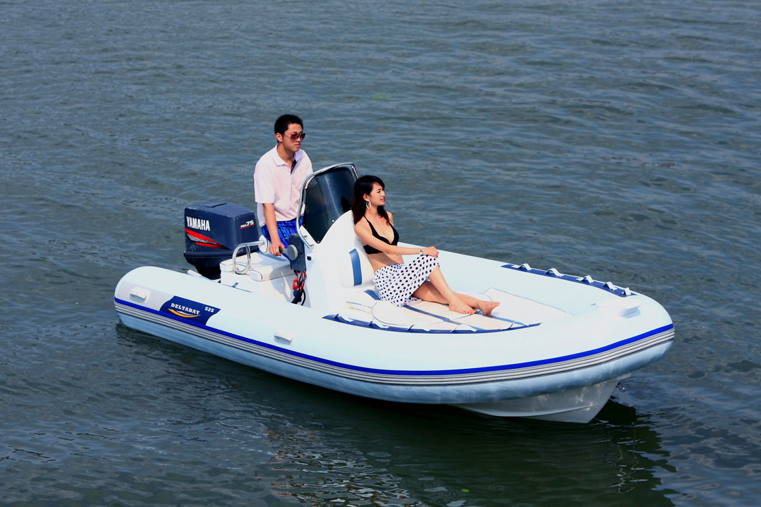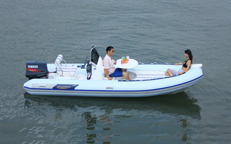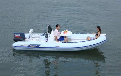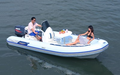 This RIB550 comes with amazing features including rigged deep V hull with built-in stringers, stylish console with windscreen and handrail, lots of storage under deck and seat, bow platform with anchor roller, and a real bench seat with foldable backrest that can be used as a higher helm seat. Other details reveal the boat's style: selectable tube color and full upholstery, an extra removable picnic table that can create a larger sunbathing area and the option to install a bimini top (sun awning) that can be opened in seconds.