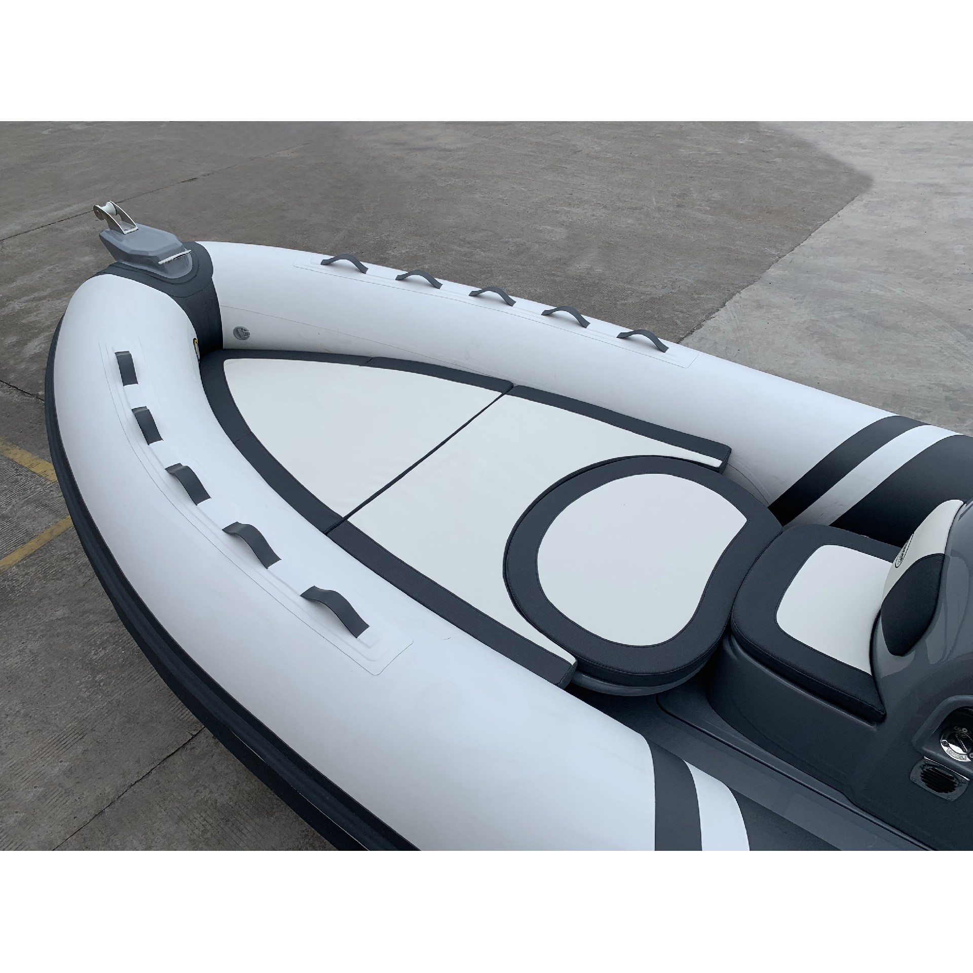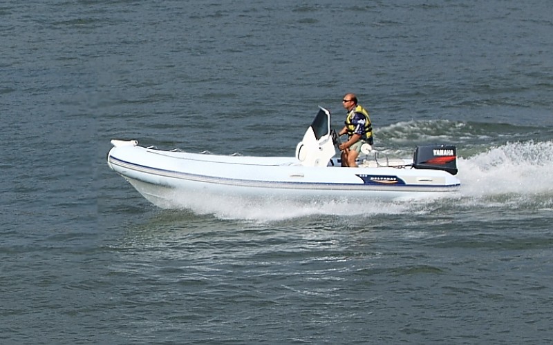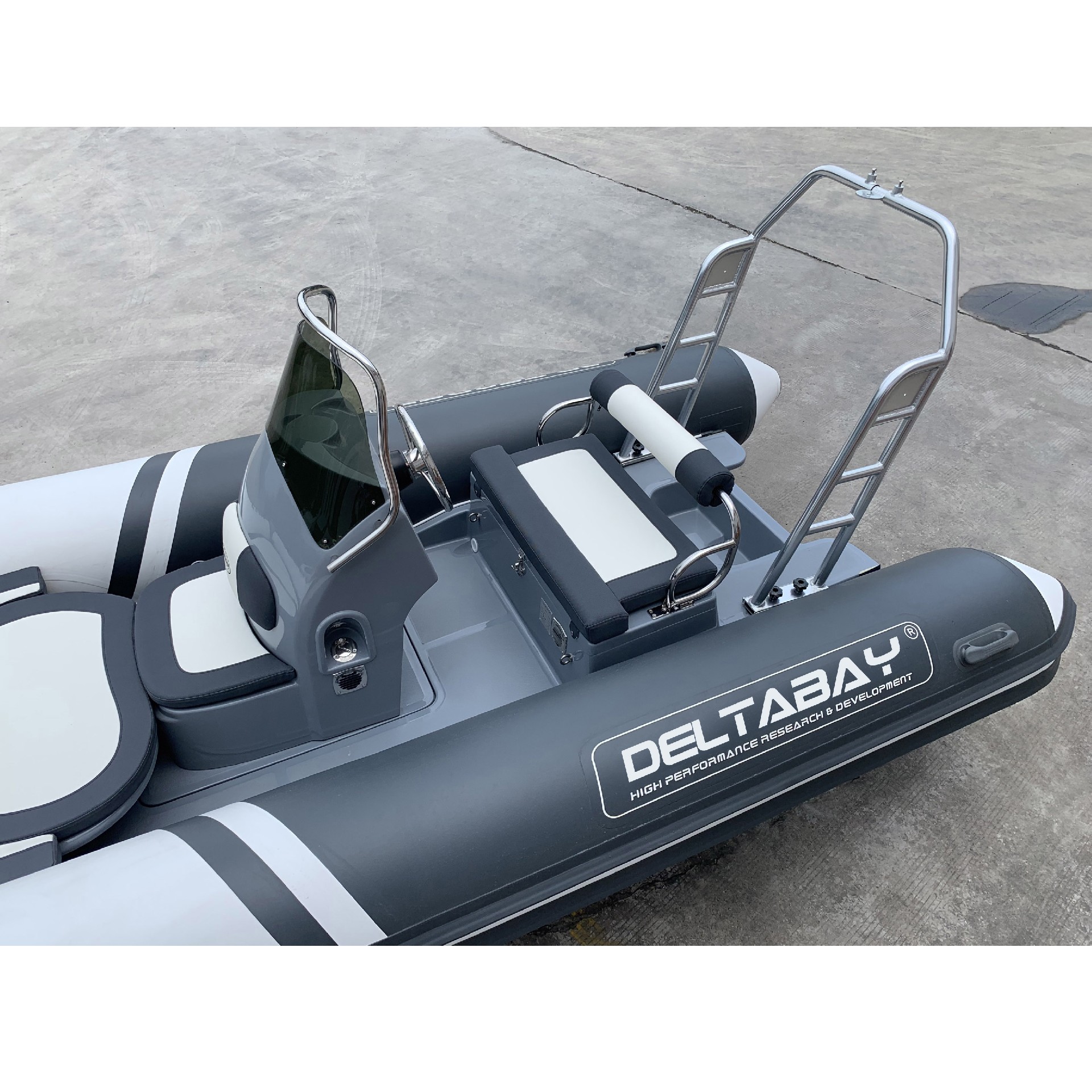 This RIB550 comes with amazing features including rigged deep V hull with built-in stringers, stylish console with windscreen and handrail, lots of storage under deck and seat, bow platform with anchor roller, and a real bench seat with foldable backrest that can be used as a higher helm seat. Other details reveal the boat's style: selectable tube color and full upholstery, an extra removable picnic table that can create a larger sunbathing area and the option to install a bimini top (sun awning) that can be opened in seconds.