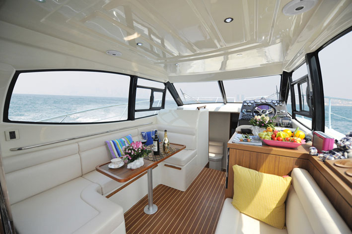 OCEANIA 45WA钓鱼艇汇聚着西班牙人的智慧与海钓经验,同时又融合了休闲游艇所秉承的高雅舒适。OCEANIA 45WA 设计非常大气与巧妙,独特的流线造型,足够大的钓鱼平台,钓鱼设施齐全,配有活鱼舱、冷藏舱、鱼竿插座、切鱼台等等,前甲板和后甲板可以自由穿梭,甲板四周都可以安全舒适地进行垂钓。室内配有多功能沙龙休闲区、独立大床房、衣柜、浴室、热水器、酒柜、冰箱、微波炉 等等应有尽有。