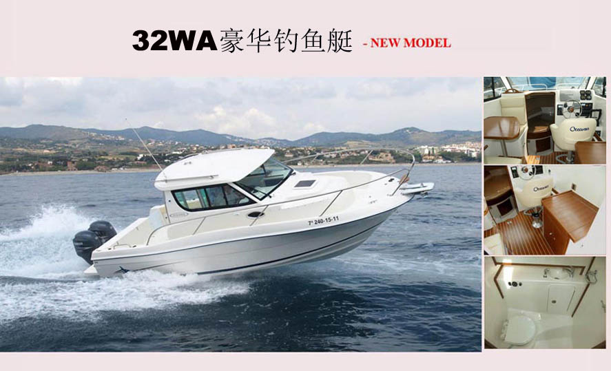 风靡欧美的新型豪华钓鱼艇,先进的船体设计,航行性能特别优越,稳定性好,抗风浪性极强,前甲板与后甲板可自由穿梭走动,宽敞的尾甲板同时配备多个鱼竿插座、活鱼舱、储物舱以及可方便折叠的沙发座椅,可供8人同时垂钓,室内配有沙龙式驾驶舱、卫生间、双人大床以及冰箱、厨台、酒柜等配置一应俱全,舒适的休闲钓鱼空间和高雅整洁的舱室可让您尽情享受游玩与钓鱼的乐趣。