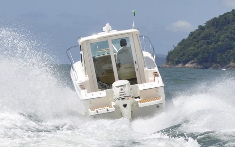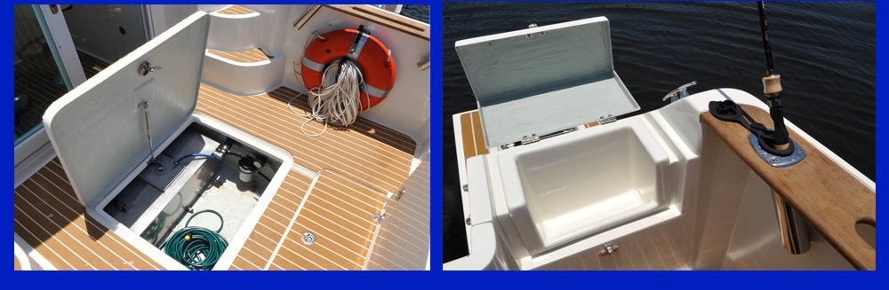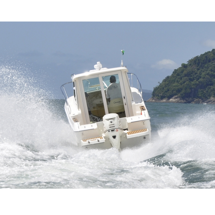 Her long list of standard features includes larger walking cockpit, integral fuel tank, cabin lockable sliding door, water proof sliding side windows in wheelhouse, overhead interior LED lighting throughout, generous on board storage and a molded polish fiberglass headliner in wheelhouse which provides a luxury feel and easy maintenance. There is a molded bench seat in the starboard side of the wheelhouse and comfortable U-shaped lounge in the forward cabin that converts into a berth. The forward cabin can also be equipped with a portable, electric toilet with a holding tank and macerator. For water sports enthusiasts, there has two big swim platforms and one of them features a recessed telescoping stainless steel ladder for easy water access.